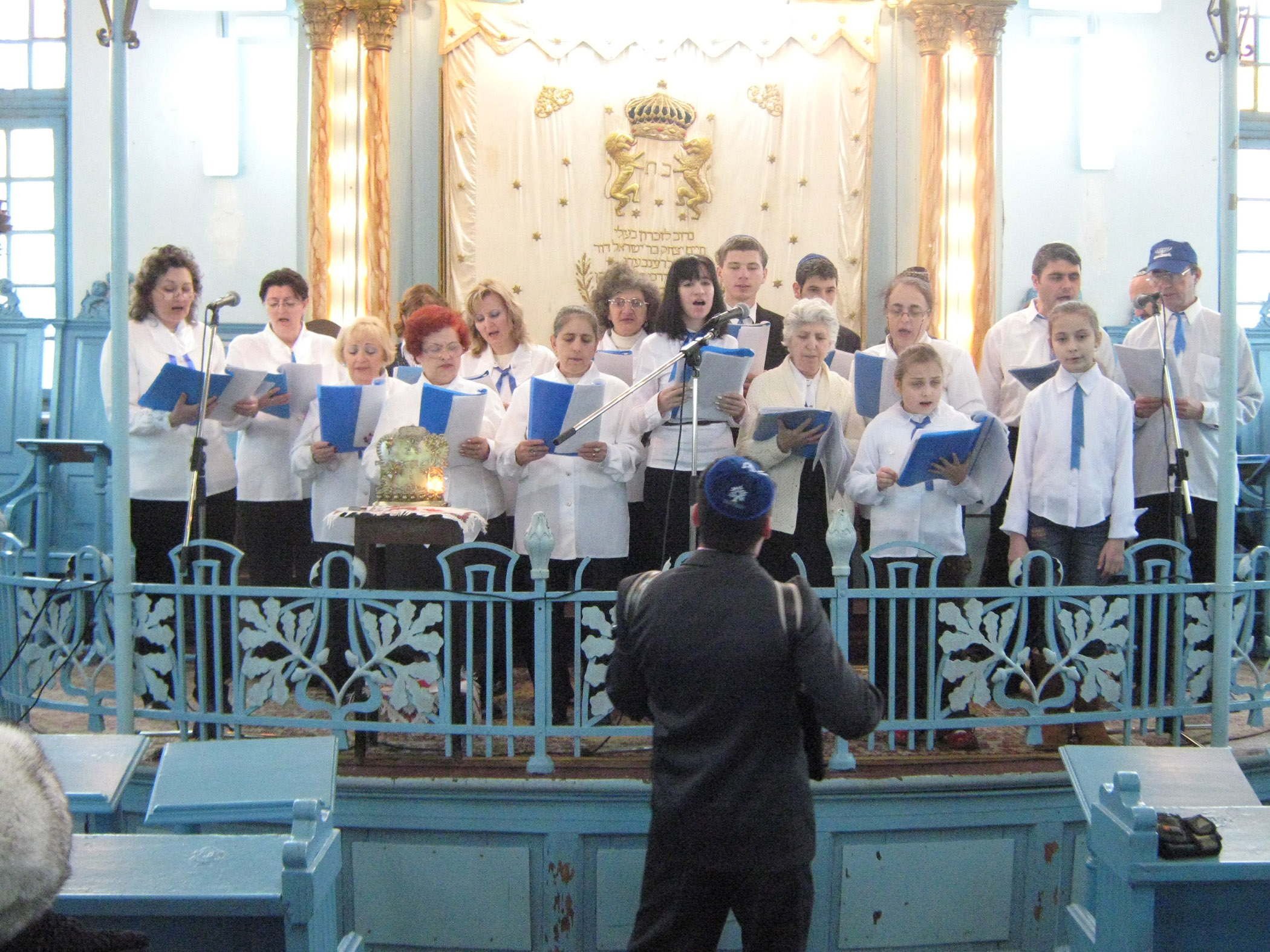 Corul “ Macabi” condus de D-nul profesor Lifsin Bogdan a intonat melodii traditionale evreiesti, oficiantul de cult D-nul Goldstein Suchar impreuna cu cel mai mic copil evreu, Cazacu Lior Daniel au aprins luminitele de Hanuca. S-au facut rugaciuni pentru pacea credinciosilor a statului Roman si Israel.