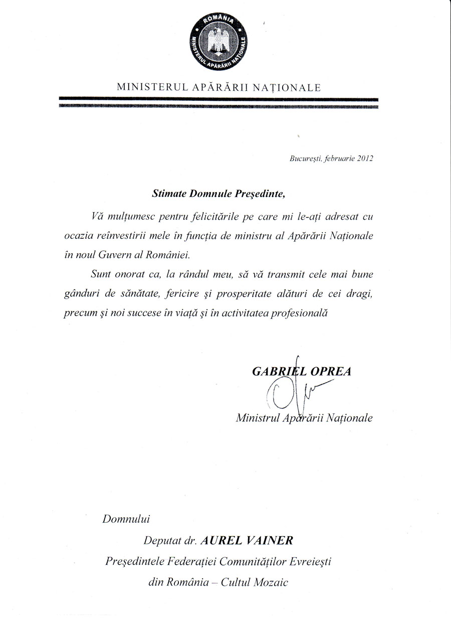 27 februarie 2012 - Scrisoarea de raspuns s Dl. Gabriel Oprea cu ocazia reinvestirii in functia de Ministru al Apararii
